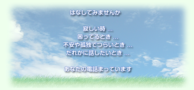 毎月10日の午前8時から翌朝午前8時までの24時間、 そして、毎日午後4~9時は全国の「いのちの電話」をネットワークとして、 自殺予防に特定した通話料無料の電話相談を行っています。